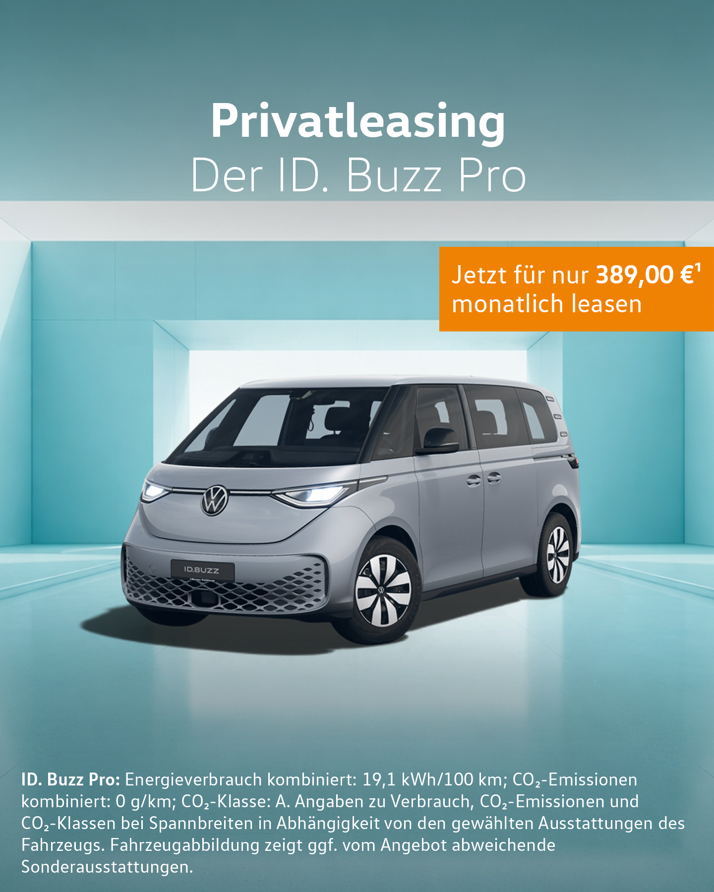 Privatkunden-Leasingangebot: ID. Buzz Pro kurzer Radstand KR 210 kW 79 kWh 1-Gang-Automatik für nur 389,00 €¹ monatlich.